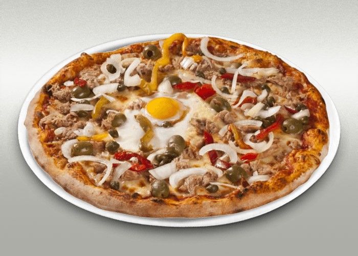 Tomate, fromage, thon, oignons, poivrons, boursin, oeuf.